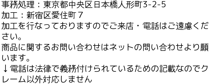 また、その素材感・納品時の状態(シワが多いなど)に関しての説明は特に記載していませんので、初めてのご購入時でご心配な場合はお客様から当店へお気軽にお問い合わせ下さい。